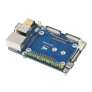 Raspberry Pi Compute Module 4 I / O Mini Base Board (19602) — базова плата для роботи з обчислювальним модулем Raspberry Pi Compute Module 4, яка надає можливість користуватися усіма фізичними роз'ємами інтерфейсів, закладеними в конструкції цього обчислювального модуля, в тому числі мережевих RJ45, HDMI, роз'ємами камери і дисплея, USB, ну і звичайно повнорозмірним GPIO 40Pin з кольоровим маркуванням. По суті виходить зібраний аналог Raspberry Pi 4В, що має понад те вбудований тримач для батареї і роз'єм М.2 для підключення NVME SSD.